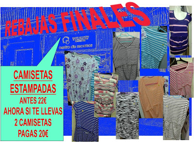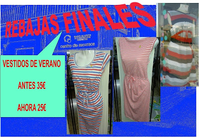 SEGUNDAS REBAJAS 3 de septiembre de 2013 / VariosREBAJAS FINALESTEXTIL DE VERANO POR DEBAJO DEL PRECIO DE COSTECamisetas estampadas ahora a 10€ cada una comprando dos pagas sólo 20€. Hasta agotar existencias.VESTIDOS DE RAYAS ahora 25€. Hasta agotar existencias.
